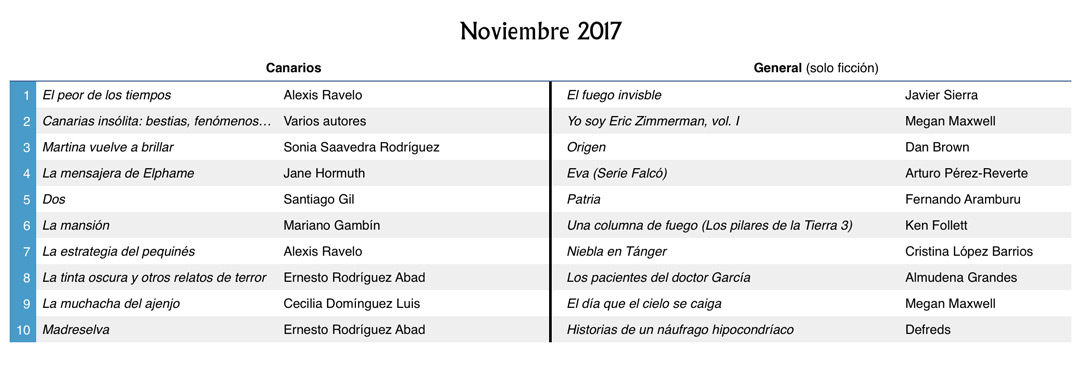Javier Sierra, por su parte, entra como una exhalación en el listado de títulos no canarios, alcanzando la primera posición —el Premio Planeta es lo que tiene— con El fuego invisible (Planeta, 2017). También entran Yo soy Eric Zimmerman (Esencia, 2017), de Megan Maxwell —segunda posición—, Niebla en Tánger (Planeta, 2017), de Cristina López Barrios —séptima— y El día que el cielo se caiga (Esencia, 2017), también de Maxwell.